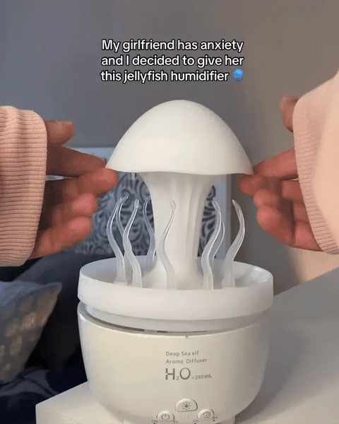 This humidifier adds moisture to the air while creating a gentle, soothing visual effect inspired by a floating jellyfish. The soft glow and smooth movement make it perfect for relaxing, studying, or winding down at night. It also works as an aroma diffuser, letting you add your favorite scents for a more calming atmosphere. Quiet, easy to use, and built to bring a sense of comfort to any room.